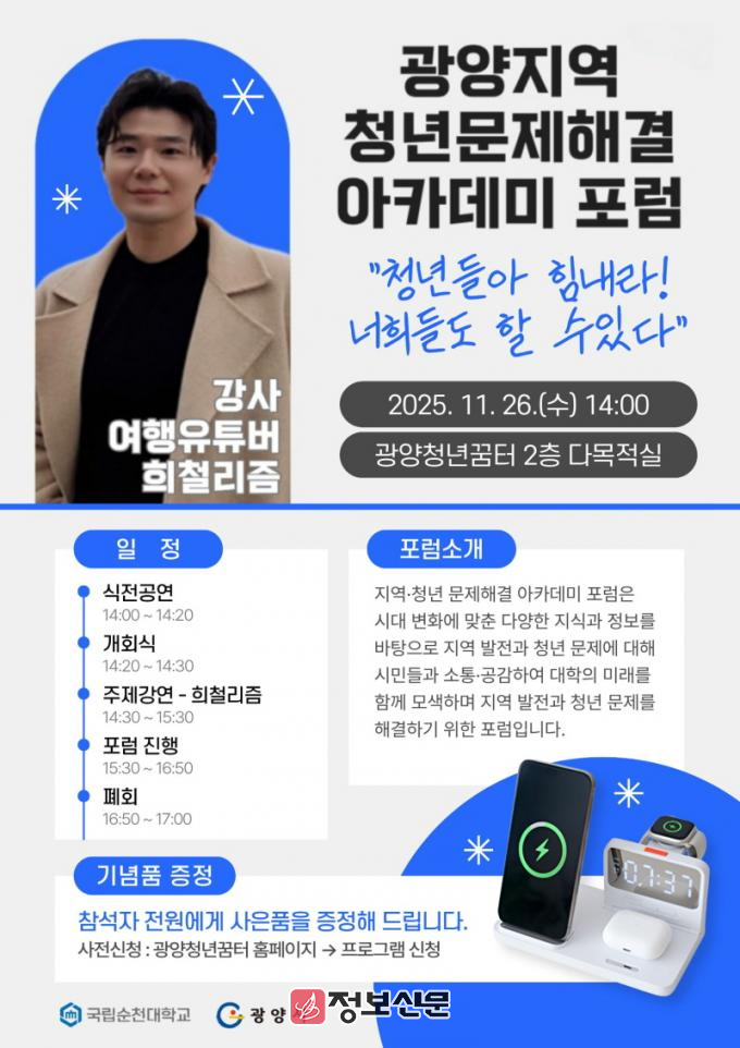 이번 포럼은 광양시민 누구나 참여할 수 있으며, 광양청년꿈터 누리집(홈페이지) ‘꿈터 프로그램’에서 11월 25일까지 신청 가능하다. 순천대학교는 현장에서 온라인 설문조사를 실시하고, 참여 청년들에게 유용한 멀티 무선충전기를 사은품으로 배부할 계획이다.