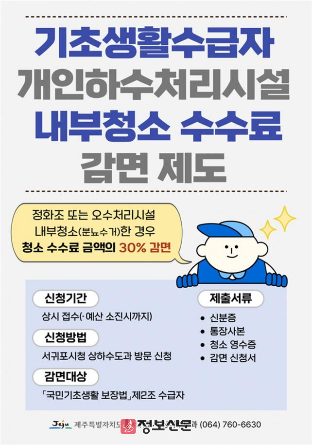 「제주특별자치도 하수도 사용 조례」 제57조에 따라 「국민기초생활 보장법」에 따른 급여 수급자(생계·의료·주거·교육)는 정화조 또는 오수처리시설 내부청소 수수료의 30%를 감면받을 수 있다.