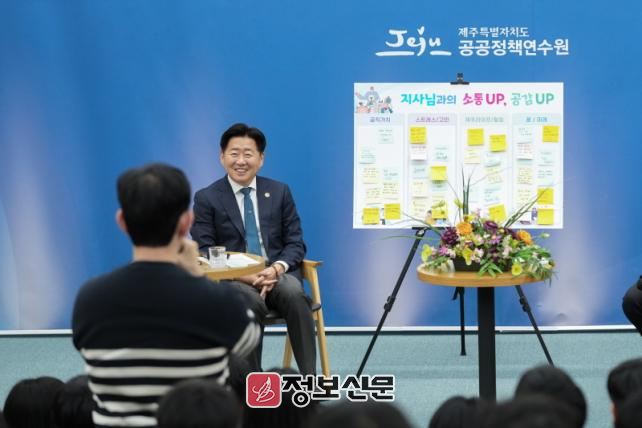 제주도 24일 오전 공공정책연수원 대강당에서 제3기 신규임용자과정 교육생 100명*을 대상으로 ‘지사와 함께하는 소통 프로그램’을 운영했다고 밝혔다. 이번 자리는 새롭게 공직에 입문한 MZ 신규공무원들의 고민과 질문을 직접 듣고, 도정 운영 방향과 미래 행정의 비전을 공유하기 위해 마련됐다.