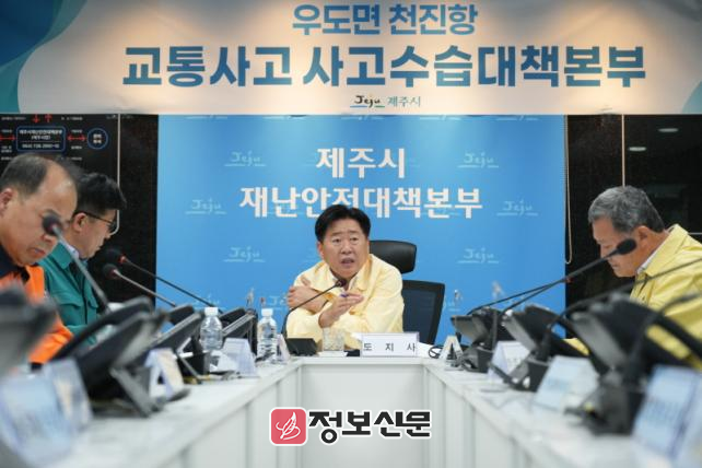 오영훈 지사는 우도 사고 현장 점검에 이어 오후 6시경 제주시 재난상황실을 방문해 상황판단회의를 주재하며 운영 상황을 점검하고 추가 대응 방안을 논의했다. 오 지사는 “피해자별로 1대 1 전담공무원을 지정해 의료 지원과 환자 관리에 나서는 한편, 장례 절차 등 필요한 모든 지원에 총력을 다하라”고 지시했다.