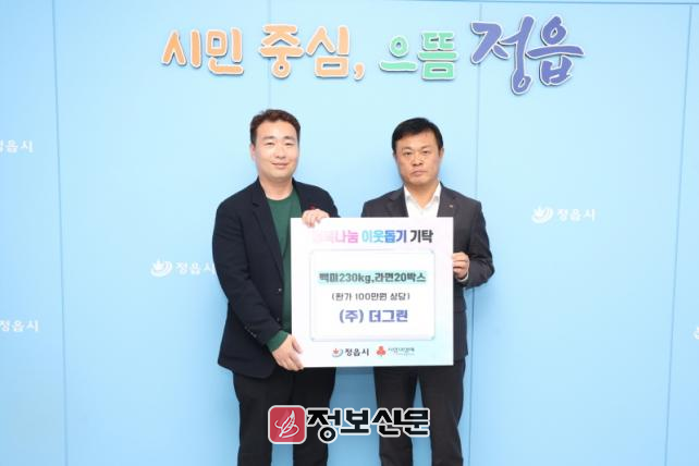 ㈜더그린(대표 김윤섭)은 지난 25일 100만원 상당의 백미 230kg과 라면 20박스를 정읍시에 기탁하며 지역사회 나눔 문화 확산에 동참했다.