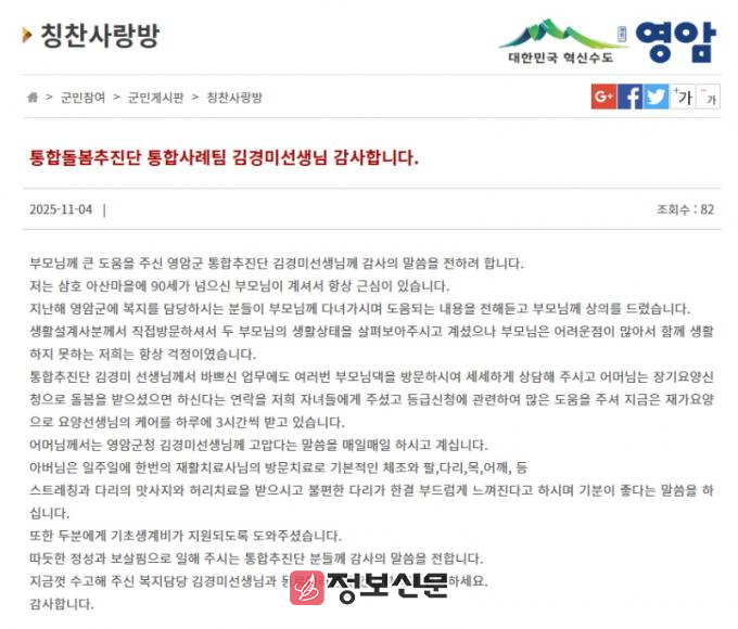 ![]() 영암군 통합사례관리사, 위기 가정 어르신 골든타임 지켜 |