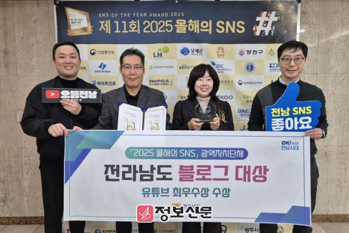 전남도는 26일 ‘2025 올해의 SNS’에서 광역자치단체 블로그 ‘대상’과 유튜브 ‘최우수상’을 받았다. 앞서 지난 7월 ‘소셜아이어워드 2025’에서 광역자치단체 블로그 ‘대상’, 유튜브·인스타그램 ‘최우수상’에 이어 10월 ‘2025 대한민국 SNS 대상’에서 ‘최우수상’을 받아 국내 최고 권위 3개 SNS 어워드에서 모두 수상하는 쾌거를 이뤘다.
