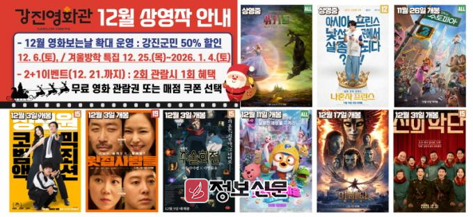 이번 겨울방학 특집 ‘영화 보는 날’은 크리스마스, 송년 주간, 신정 연휴가 이어지는 기간 동안 11일 연속으로 진행되며, 강진군민이라면 누구나 최신 영화를 50% 할인된 가격으로 관람할 수 있다.