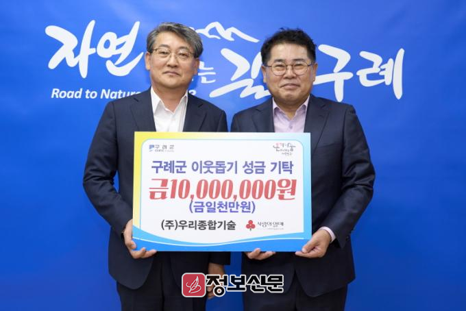 김순호 구례군수는 “우리종합기술과 윤지현 아너소사이어티 회원님의 지속적인 나눔 참여에 깊은 감사를 드린다”며 “기탁된 성금은 복지사각지대 발굴을 통해 꼭 필요한 곳에 투명하게 전달하여 어려운 이웃들이 따뜻한 겨울을 보낼 수 있도록 하겠다”고 말했다.