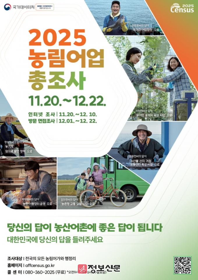 조사대상 가구에는 국가데이터처에서 조사안내문을 발송했으며, 인터넷 조사는 11월 20일부터 진행 중이다. 참여는 농림어업총조사 홈페이지(affcensus.go.kr)를 통해 12월 10일까지 가능하다.