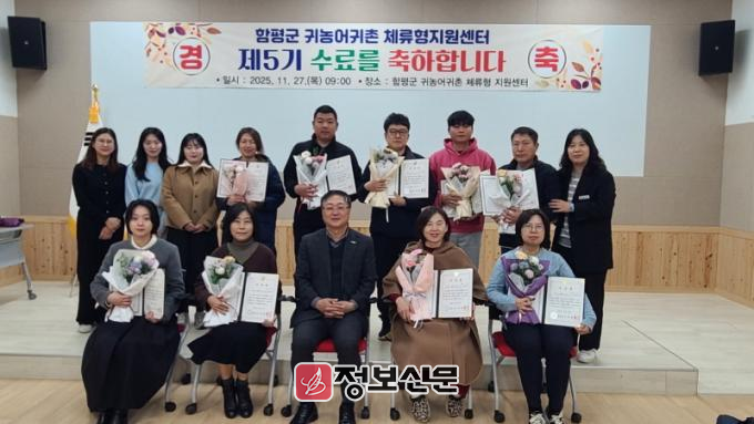 함평군은 30일 “함평군 귀농어귀촌 체류형 지원센터 제5기 수료식이 지난 27일 교육생과 가족 등 20여 명이 참석한 가운데 성황리에 마무리됐다”고 밝혔다.