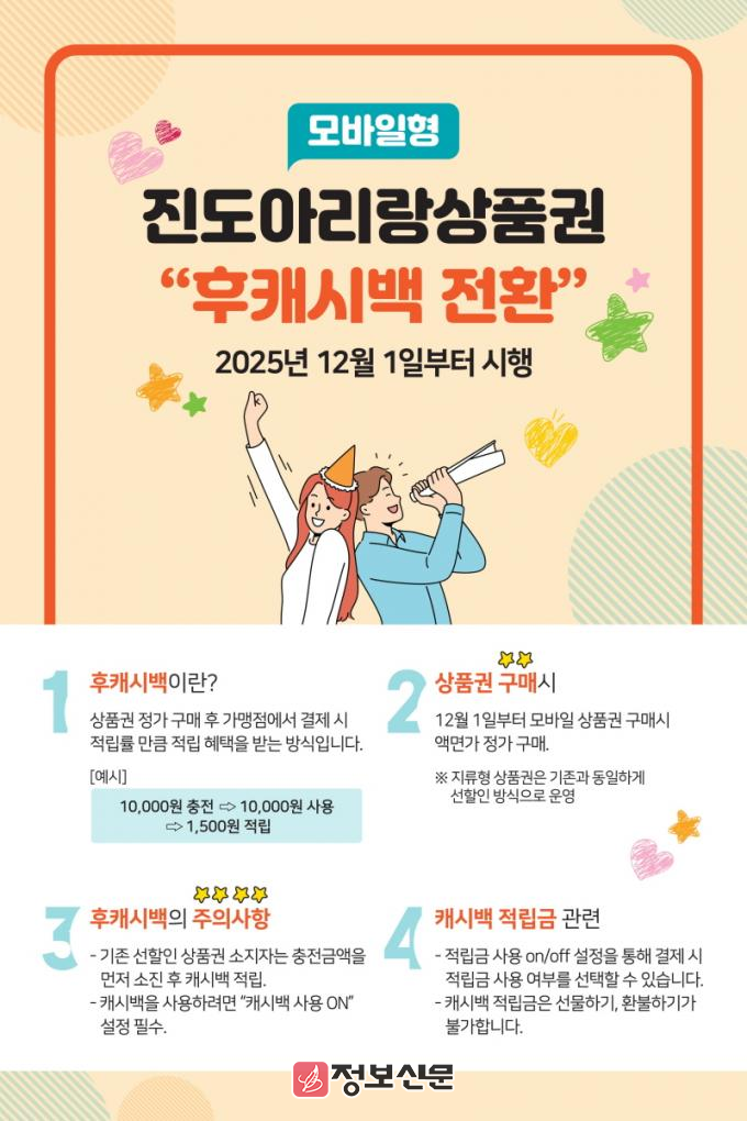 ![]() 진도군, 진도아리랑상품권 12월 1일부터 ‘후적립(후캐시백) 방식’ 도입 |
