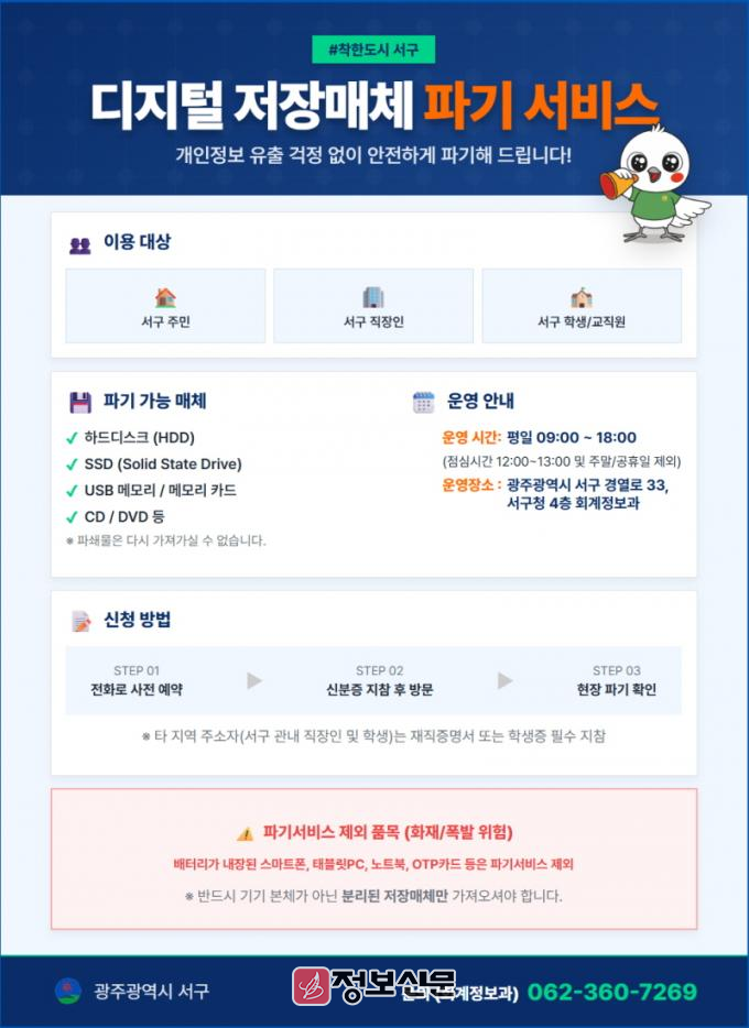 ![]() 광주시 서구, 디지털 저장매체 무료 파기 서비스 제공 |