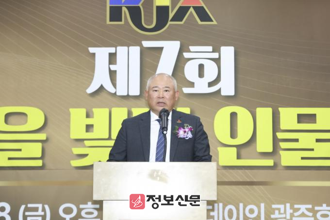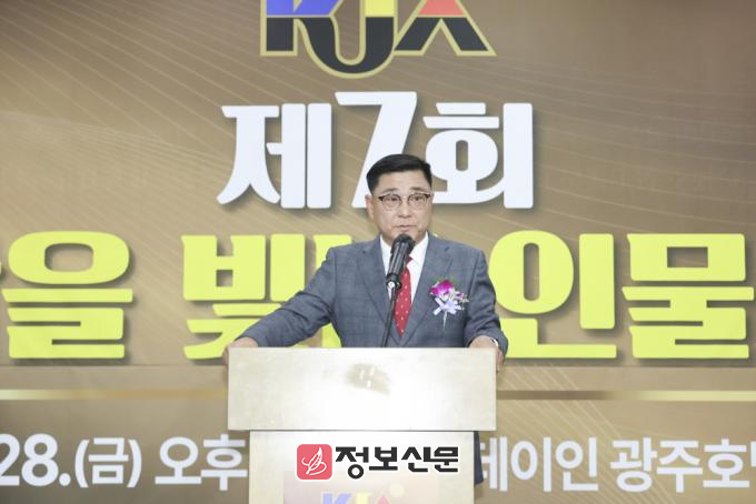 ![]() ▲(사)대한기자협회 광주·전남협회가 주최한 2025년 ‘제7회 호남을 빛낸 인물대상’ 시상식에서 정훈 협회장이 대회사를 하고 있다. |