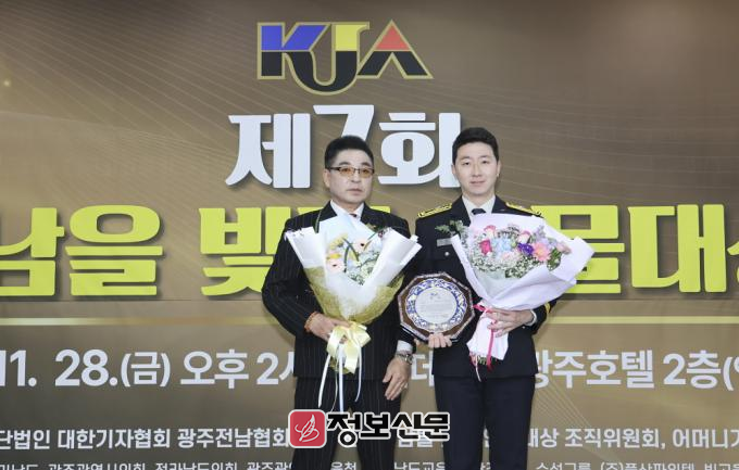 ![]() ▲ 11월 28일 광주 홀리데이 인 광주호텔 2층 연회장에서 열린 ‘2025년 제7회 호남을 빛낸 인물대상’ 시상식에서, (사진 오른쪽) 이재웅 해남소방서 땅끝119안전센터 소방위가 사회부문 ‘모범소방’대상을 수상한 뒤 기념촬영을 하고 있다. |