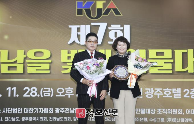 ![]() ▲ 11월 28일 광주 홀리데이 인 광주호텔 2층 연회장에서 열린 ‘2025년 제7회 호남을 빛낸 인물대상’ 시상식에서, (사진 오른쪽) 오경미 광주교육발전포럼 대표가 교육부문 ‘교육’대상을 수상한 뒤 기념촬영을 하고 있다. |