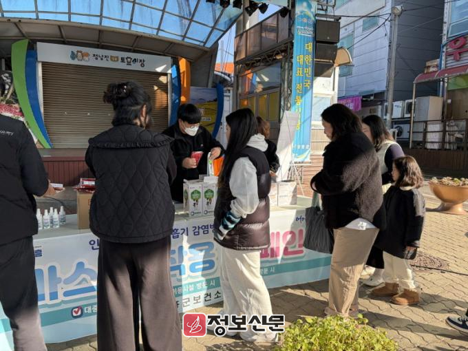 군은 30일 장흥 토요시장 일원에서 시장 방문객을 대상으로 예방접종 독려, 마스크 등 예방 물품 배부, 감염병 예방수칙 홍보 등을 실시하며 마스크 착용 캠페인을 진행했다.