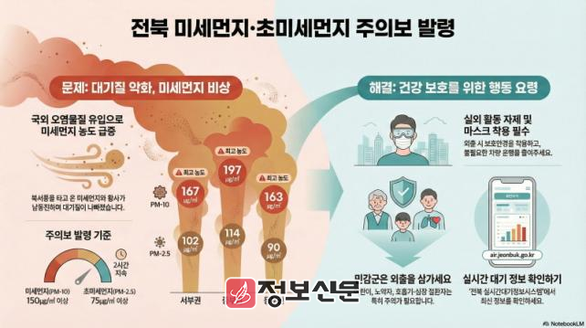 ![]() 전북특별자치도 보건환경연구원, 전북 전권역 미세먼지 주의보 발령 |