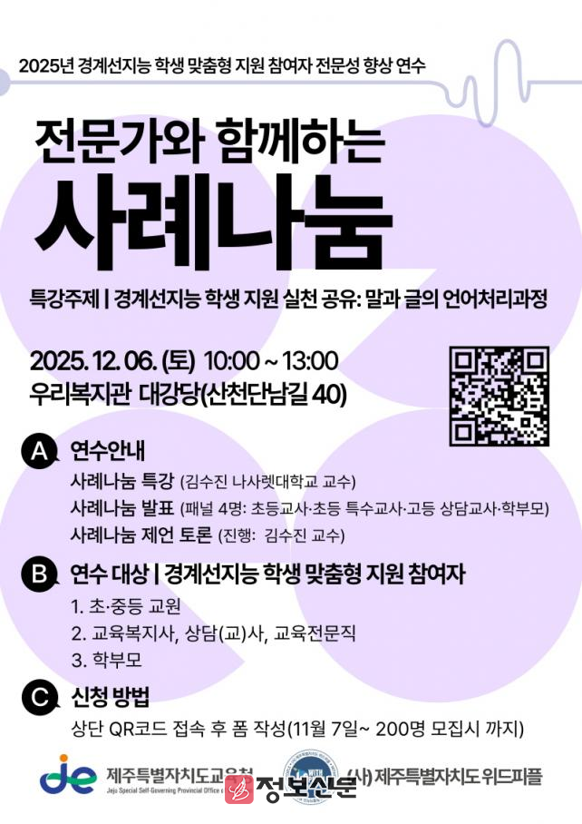 ![]() 제주특별자치도교육청, 경계선지능 학생 맞춤형 지원 연수 성과공유회 개최 |