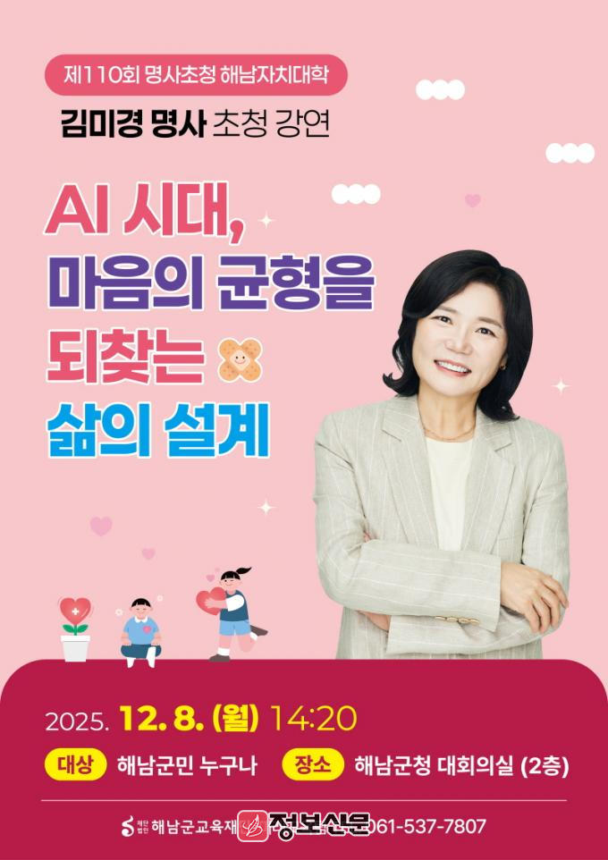 해남군 관계자는“이번 강연을 통해 군민들이 AI 시대에 필요한 관점과 균형 잡힌 삶의 태도를 배우는 의미 있는 시간이 되길 바란다”며“앞으로도 군민의 삶의 질 향상을 위한 다양한 교육 프로그램을 지속적으로 운영하겠다”고 밝혔다.