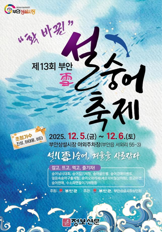 김형호 부안상설시장 상인회장은 “제13회 부안설숭어 축제를 통해 시장에 활력이 돌아오고, 군민과 관광객 모두가 따뜻한 겨울의 추억을 쌓는 계기가 되길 바란다.”며 “많은 분들의 방문과 참여를 부탁드린다.”고 말했다.