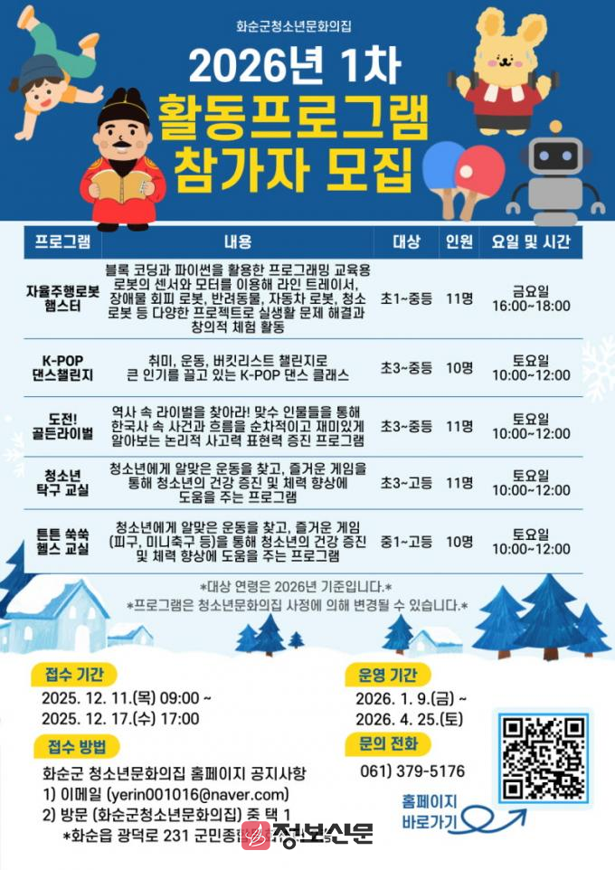 ![]() 화순군 청소년문화의집, 2026년 1차 문화프로그램 수강생 모집 |