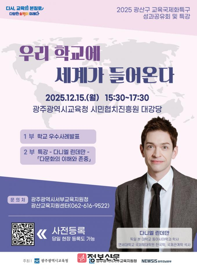 광주서부교육지원청 이성철 교육장은 “올해 성과공유회는 광산구 교육국제화특구가 앞으로 나아가야 할 방향을 제시하는 계기가 될 것”이라며 “학생들이 일상 속에서 세계를 만나고, 다양한 문화를 존중하며 함께 성장할 수 있는 교육환경이 조성되도록 최선을 다하겠다”고 말했다.