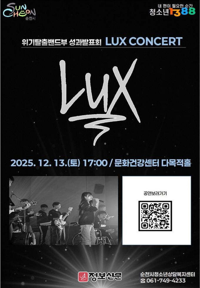![]() 순천시, 청소년 밴드 “LUX(빛)” 연말 콘서트 개최 |