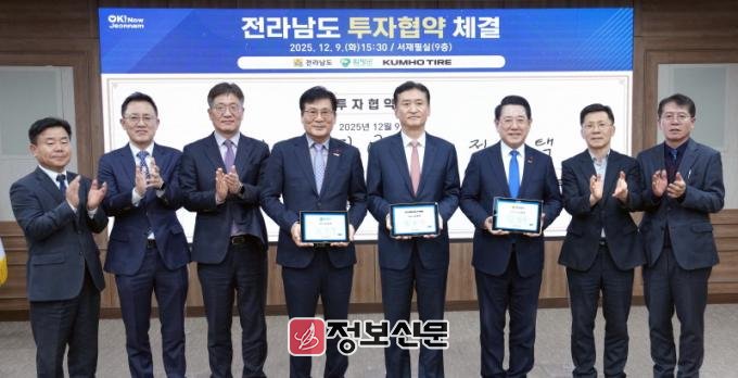 함평군은 지난 9일 전라남도청 서재필실에서 전라남도와 금호타이어가 함평 신공장 건립을 위한 투자협약을 체결했다고 10일 밝혔다. 협약식에는 김영록 전남도지사, 이상익 함평군수, 정일택 금호타이어 대표이사가 참석했다.