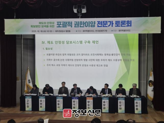 제주도는 10일 오후 4시 제주관광공사 웰컴홀에서 한국법제연구원과 공동으로 ‘포괄적 권한이양 안정성 확보 방안 마련을 위한 전문가 토론회’를 개최했다. 이번 토론회에는 학계와 관계기관, 도민 등 100여 명이 참석해 포괄적 권한이양 도입에 따른 안정성 담보 장치를 어떻게 제도화할 것인지 논의했다.
