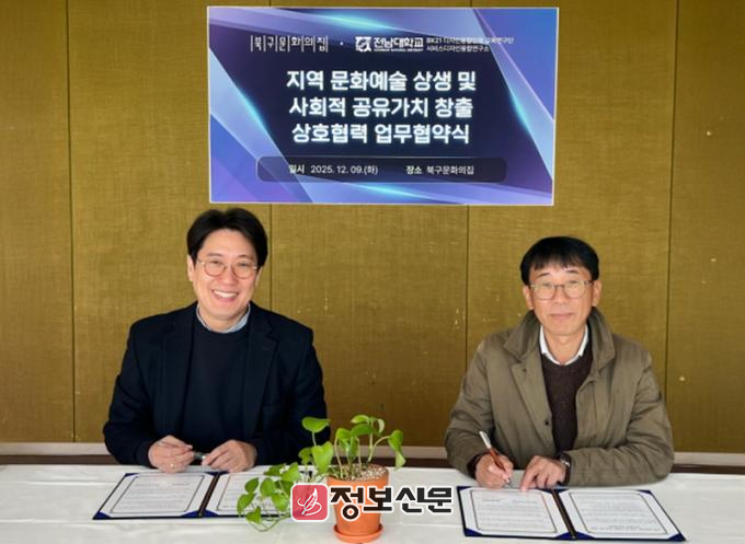 11일 전남대에 따르면, 전남대학교 BK21 휴먼케어 지능형 문화예술콘텐츠의 디자인융합인재양성 교육연구단(아트&디자인테크놀로지 협동과정)과 북구문화의집은 지난 9일 지역 문화예술 상생 및 사회적 공유가치 실현을 위한 업무협약(MOU)을 체결했다.