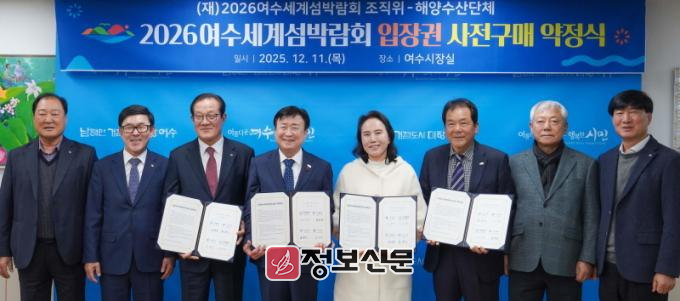 ![]() ▶(재)2026여수세계섬박람회조직위원회는 12월 11일 여수시장실에서 여수 지역 수협, 수산 단체, 수산물가공업체 등 11개 해양수산단체와 섬박람회 입장권 1억 3천만원 규모의 구매약정을 체결했다. |
