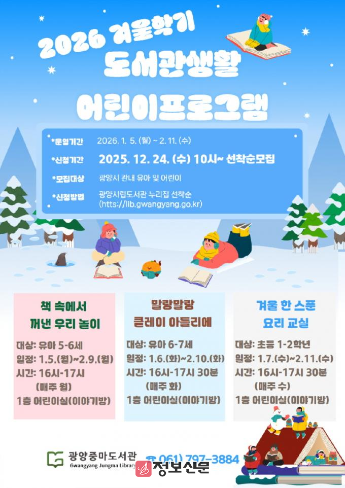 ![]() 광양중마도서관, 겨울학기 어린이 프로그램 수강생 선착순 모집 |