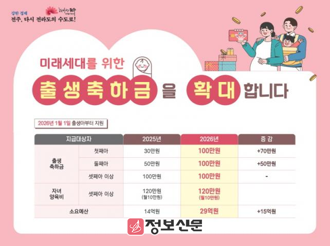 ![]() 전주시, 2026년 모든 출생아 출생축하금 100만 원 지급 |