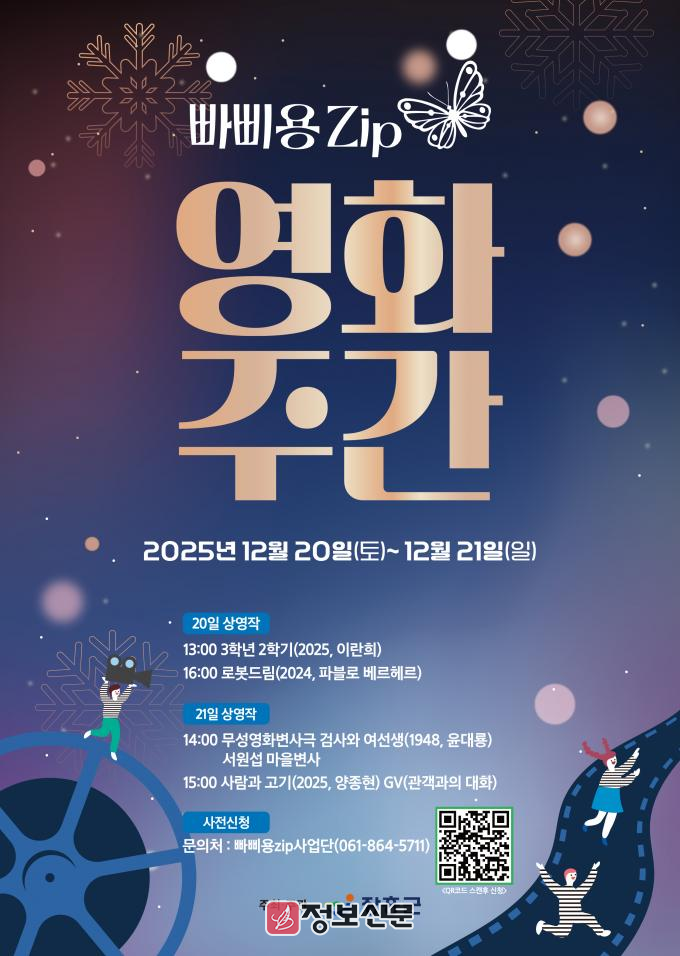 이번 ‘영화주간’은 빠삐용zip 영화당에서 열리며, 입장권을 구매한 누구나 참여가능하고, 네이버폼으로 사전신청할 수 있다. 기타 문의사항은 빠삐용zip 사업단(☎061-864-5711)로 문의하면 된다.