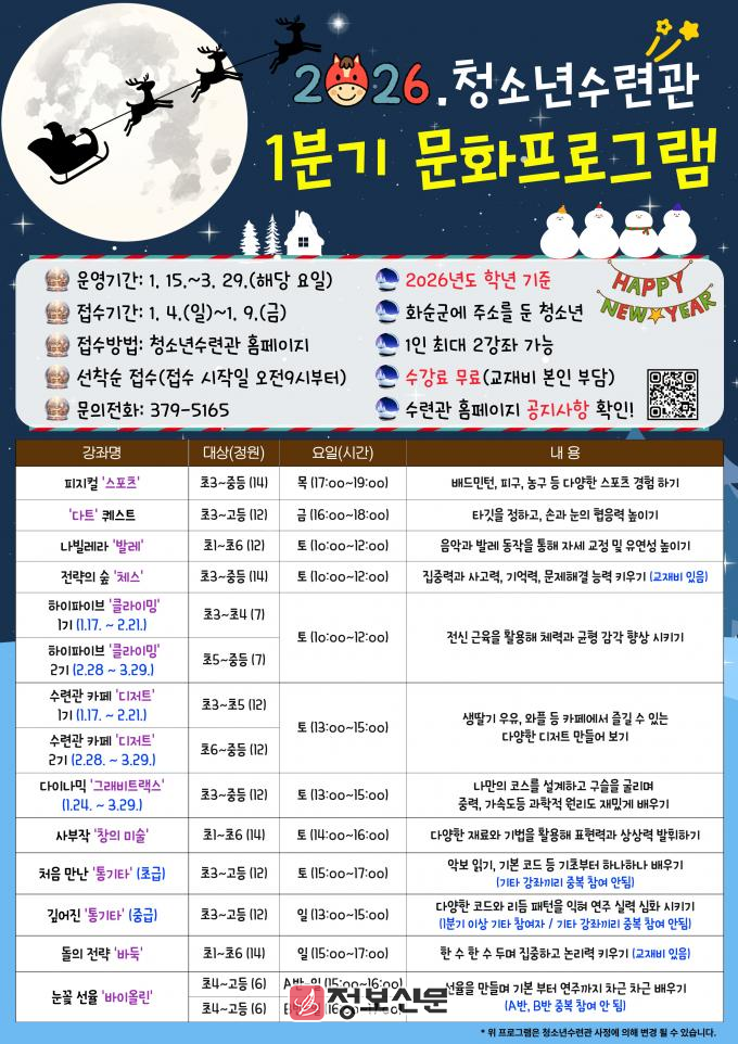 ![]() 화순군청소년수련관, ‘2026년 1분기 문화 프로그램’ 운영 |