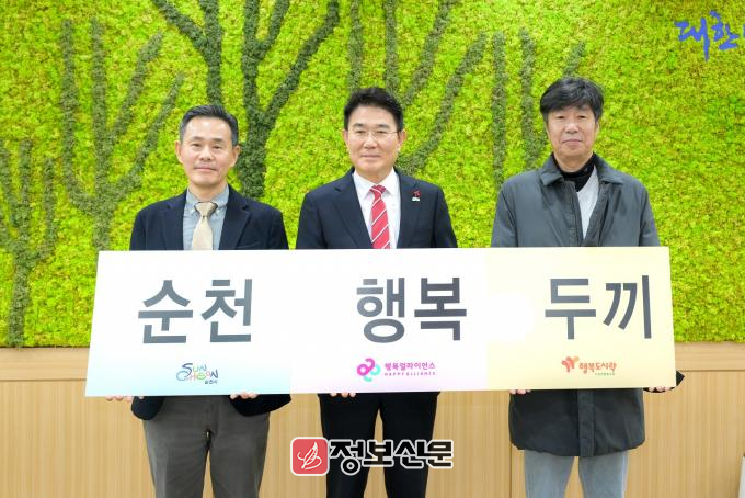16일 순천시청에서 열린 ‘순천시 행복두끼 프로젝트’ 협약식에는 노관규 순천시장, 조민영 행복얼라이언스 본부장, 최준 행복도시락 사회적협동조합 사무국장이 참석해 협약을 진행했다.