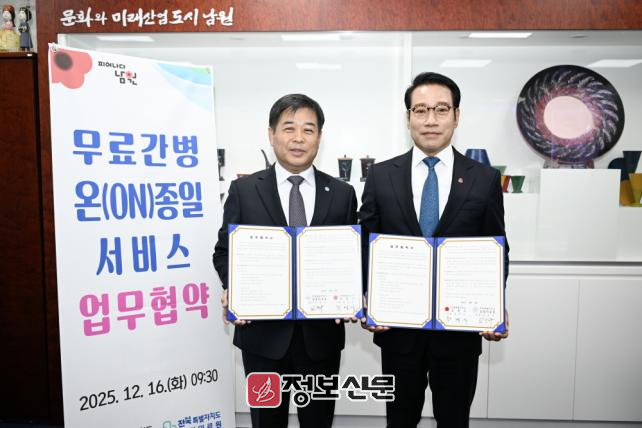 남원시 관계자는 “무료간병 온(ON)종일 서비스는 저소득층의 간병비 부담을 덜어, 치료를 포기하는 안타까운 일이 생기지 않도록 돕는 소중한 안전망”이라며, “이번 협약을 통해 지원 방법과 지원 기간을 넓혀, 시민 건강을 더욱 세심하게 살피는 데 최선을 다하겠다.”라고 밝혔다.
