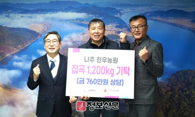 ![]() 현우농원 최진원 대표, 나주시에 백미·잡곡 300포 기탁 |