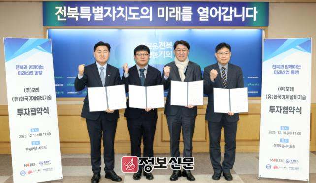 전주시와 전북특별자치도, 전북연구개발특구는 16일 전북특별자치도청에서 탄소국가산단과 전북테크비즈센터 입주를 희망하는 (유)한국기계설비기술(대표 하정성)과 ㈜모레(대표 조강원) 등 2개 기업과 총 356억 원 규모의 투자협약을 체결했다.