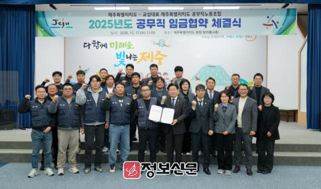 제주도와 교섭대표 노동조합인 제주도 공무직노동조합은 17일 오전 도청 탐라홀에서 ‘2025년도 공무직 임금협약’을 체결했다.