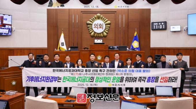 ![]() 나주시의회, 한국에너지공과대학교 총장 선임 촉구 건의안 채택 |