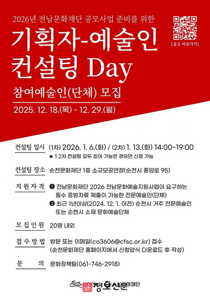 순천문화재단 관계자는 “컨설팅 Day는 순천 지역예술인이 공모사업을 보다 체계적으로 준비할 수 있도록 실질적인 도움을 제공하기 위해 마련된 프로그램”이라며 “전남문화재단 2026 전남문화예술지원사업에 참여를 희망하는 예술인들의 많은 관심과 참여를 바란다”고 말했다.