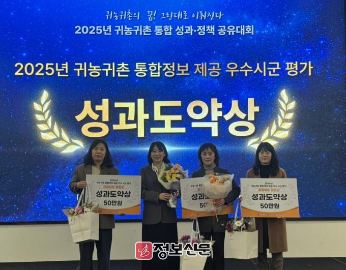농림축산식품부 주관 귀농귀촌 통합정보 제공 우수 시군 평가에서는 귀농귀촌 관련 지원사업과 교육·체험 프로그램 정보를 체계적으로 제공해 예비 귀농귀촌인의 정보 접근성과 정책 활용도를 높인 점이 긍정적인 평가를 받으며 성과도약상을 수상했다.