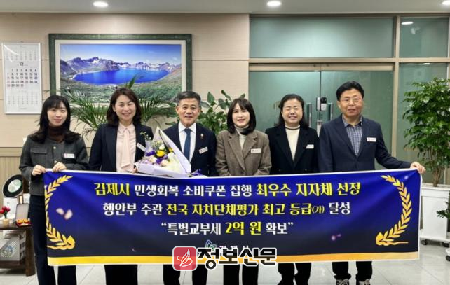 시는 민생회복 소비쿠폰 1차 지급률 99.38%, 2차 지급률 98.95%를 기록하며 전북특별자치도 내 시(市) 가운데 가장 높은 지급률을 달성했으며, 찾아가는 신청 서비스와 마을방송·문자알림 등 다양한 홍보 수단을 활용해 고령자와 장애인 등 취약계층을 포함한 대상자 누락을 최소화하기 위해 노력했다. 또한, 김제사랑카드 추첨 이벤트 등을 통해 소비 촉진과 민생지원 효과의 조기 가시화에 기여한 성과를 인정받았다.