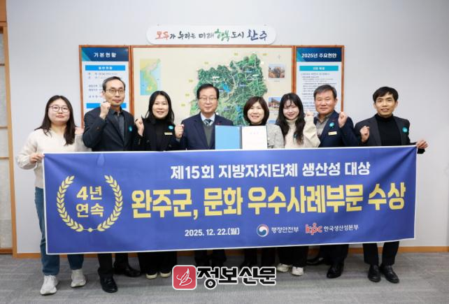 이번 지방자치단체 생산성 우수사례는 ▲경제 ▲환경 ▲문화 ▲복지 4개 분야에 전국 147개 지자체가 참여해 1차 서면심사와 2차 발표심사를 거쳐 높은 경쟁률을 뚫고 최종 12건이 선정됐다. 완주군은 지방자치단체 생산성대상을 4년 연속 수상하며, 전반적인 행정 혁신 성과를 지속적으로 인정받았다.