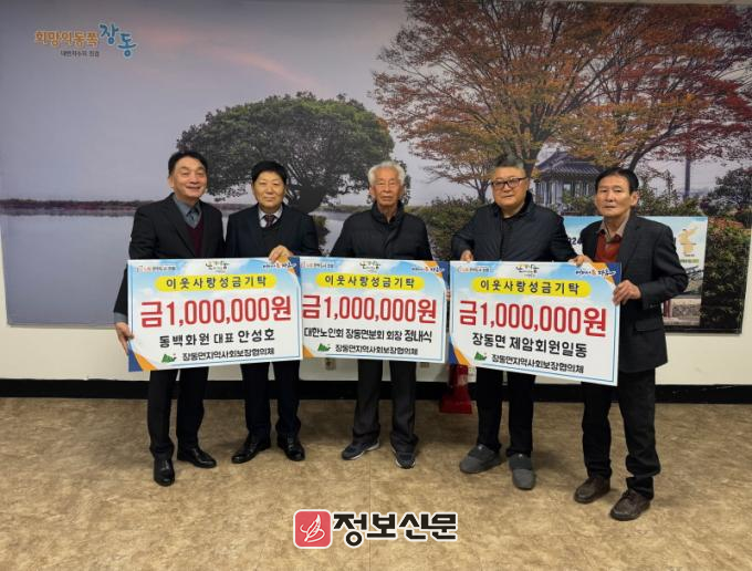 이번 기부는 대한노인회 장동면분회 회장 정내식 100만원, 동백화원 대표 안성호 100만원, 장동면 제암회원이 100만원을 기부해 지역사회의 귀감이 되고 있다.