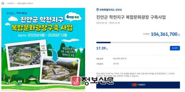 진안군 관계자는 “모금 시작 6개월 만에 1억원을 달성할 수 있었던 것은 학천지구 복합문화광장 구축이라는 사업의 필요성에 기부자 여러분께서 공감해 주신 결과”라며, “목표 모금액인 6억 원을 달성할 수 있도록 남은 모금 기간 동안에도 많은 관심과 응원 부탁드리며, 소중한 기부금이 군민의 삶의 질을 높이는 공간 조성으로 이어질 수 있도록 사업추진에 최선을 다하겠다”고 말했다.