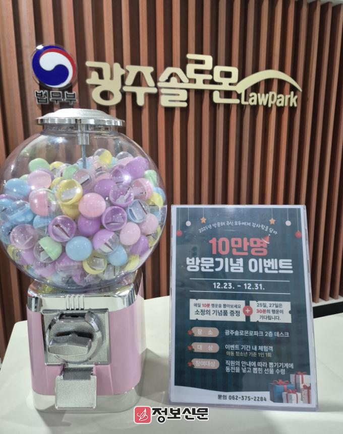 광주솔로몬로파크에 따르면 올해 1월 1일부터 12월 23일까지 광주솔로몬로파크를 방문한 법체험 관람객이 10만 명을 넘어 이를 기념하면서 연말 법체험 교육 활성화 및 방문객 확대를 위해 특별이벤트를 실시하고 있다고 전했다.