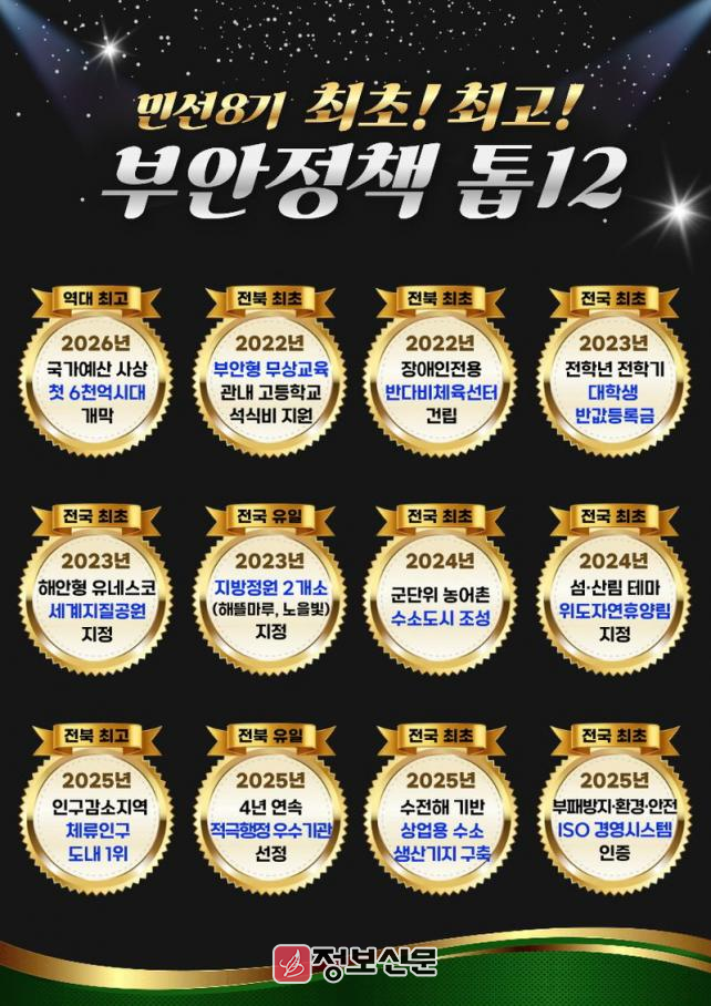 최초·최고 부안정책 톱12는 전국 최초·전국 유일·전북 최고 등 객관적이고 대외적으로 입증된 성과를 중심으로 선정됐으며 민선 8기 부안군정이 지향해 온 변화의 방향성과 정책 철학을 압축적으로 보여준다.