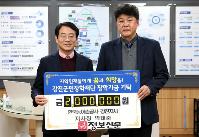 박태준 한국농어촌공사 강진지사 지사장이 2백만 원, 윤준호 전남문화관광해설사협회 강진군지회 윤준호 회장, 조성은 전(前) 나주시 농업기술센터 소장, 조인석 군동 남미륵사 풍요로운 편의점 대표, 김병림 도암면 이장단 단장, 김한춘 플랜엔지니어링(주) 대표가 각 1백만 원의 장학금을 강진군민장학재단(강진원)에 기탁 했다.