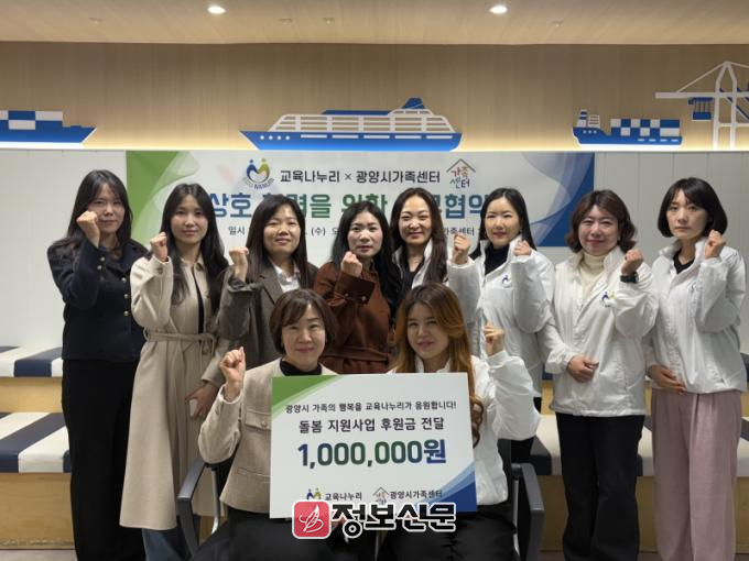협약식과 함께 열린 후원금 전달식에서는 교육나누리가 광양시가족센터 돌봄지원팀에 후원금 100만 원을 기탁했으며, 해당 후원금은 가족 대상 돌봄지원사업인 ‘공동육아나눔터’ 프로그램 운영에 활용될 예정이다.