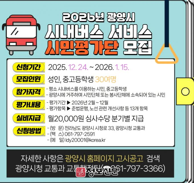 ![]() 광양시, 시민이 직접 참여하는 ‘시내버스 서비스 시민평가단’ 모집 |
