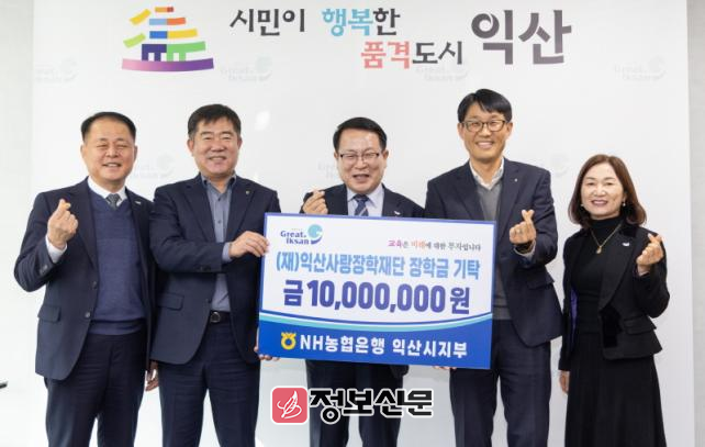 NH농협은행 익산시지부(지부장 진현욱)는 30일 (재)익산사랑장학재단(이사장 정헌율)에 장학금 1,000만 원을 기탁했다.